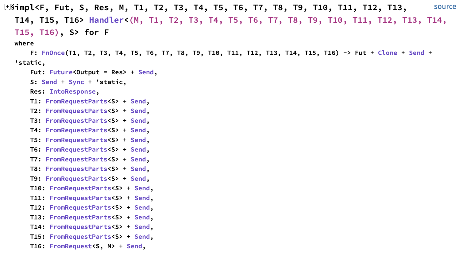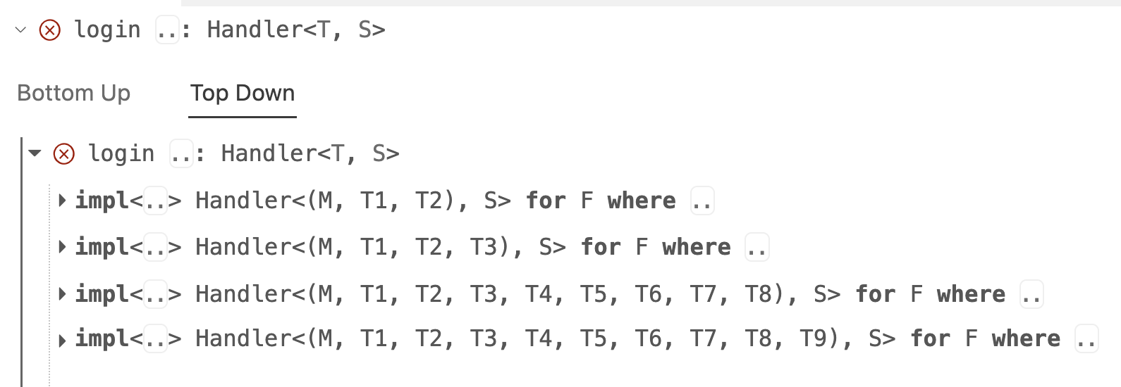 Trimming implementation headers Documentation is a crucial resource to help developers, especially when using new libraries. Rust documentation is generally good, but it could do better especially when it comes to traits and their implementors. Consider again our running example with Axum. We have a function login that fails to satisfy the criteria to implement the Handler trait. The reported error is like “trait bound login: Handler is not satisfied.” The intuition for many developers is to visit the documentation page for handlers to see what types do implement the trait. Unfortunately, the verbosity of Rust is a little jarring when sifting through dozens of implementation types in documentation.