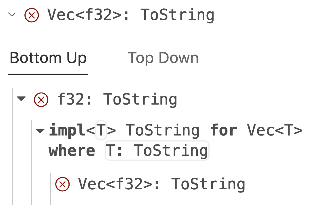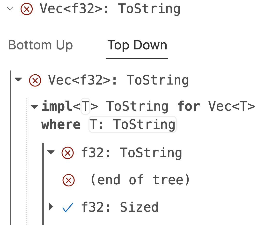 For this simple trait error, the bottom-up view shows us the same information as provided by the compiler diagnostic: an unsatisfied trait bound f32: ToString. That is our root cause. Expanding the bottom-up view shows the provenance of each bound. The top-down view of this example is uninteresting because the trait solver did no branching, and the proof tree is really a “proof stick.” Therefore, it is simply the mirror of the bottom-up view as shown in